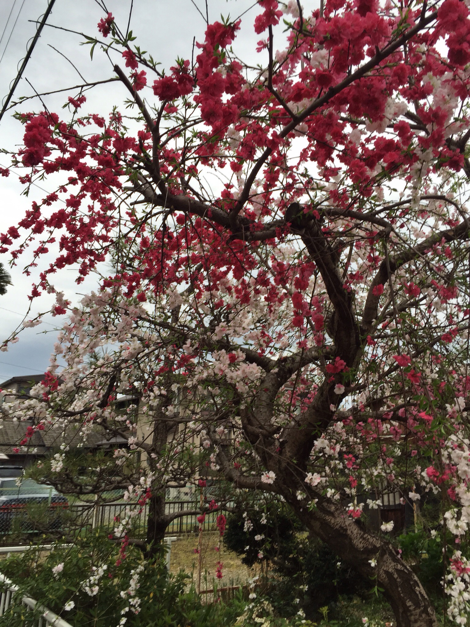 散歩の際に見つけた花桃の木。花が満開できれいです。