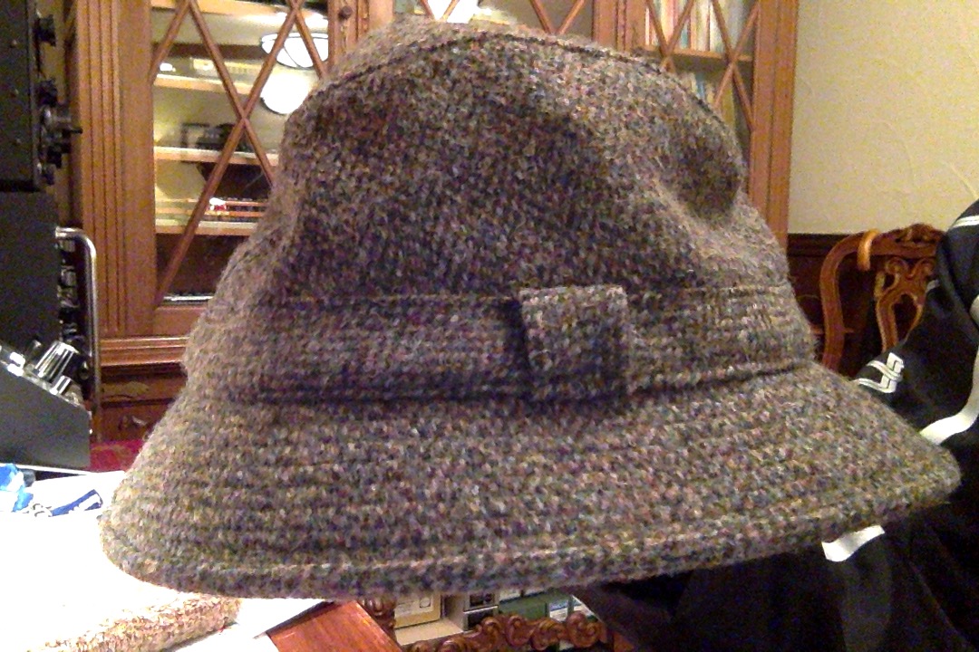 こんばんは。 10年ほど前、所用でイギリスに行った際にセールで購入したツイードの帽子です。10年間冬の間、朝のウオーキングの時に毎日着用しています。 雨の日もかぶっていますが、型くずれせずびくともしません。 継ぎ接ぎをあてて15年着ているBaborの油引きのコートともに一生買い換えずに済みそうです。